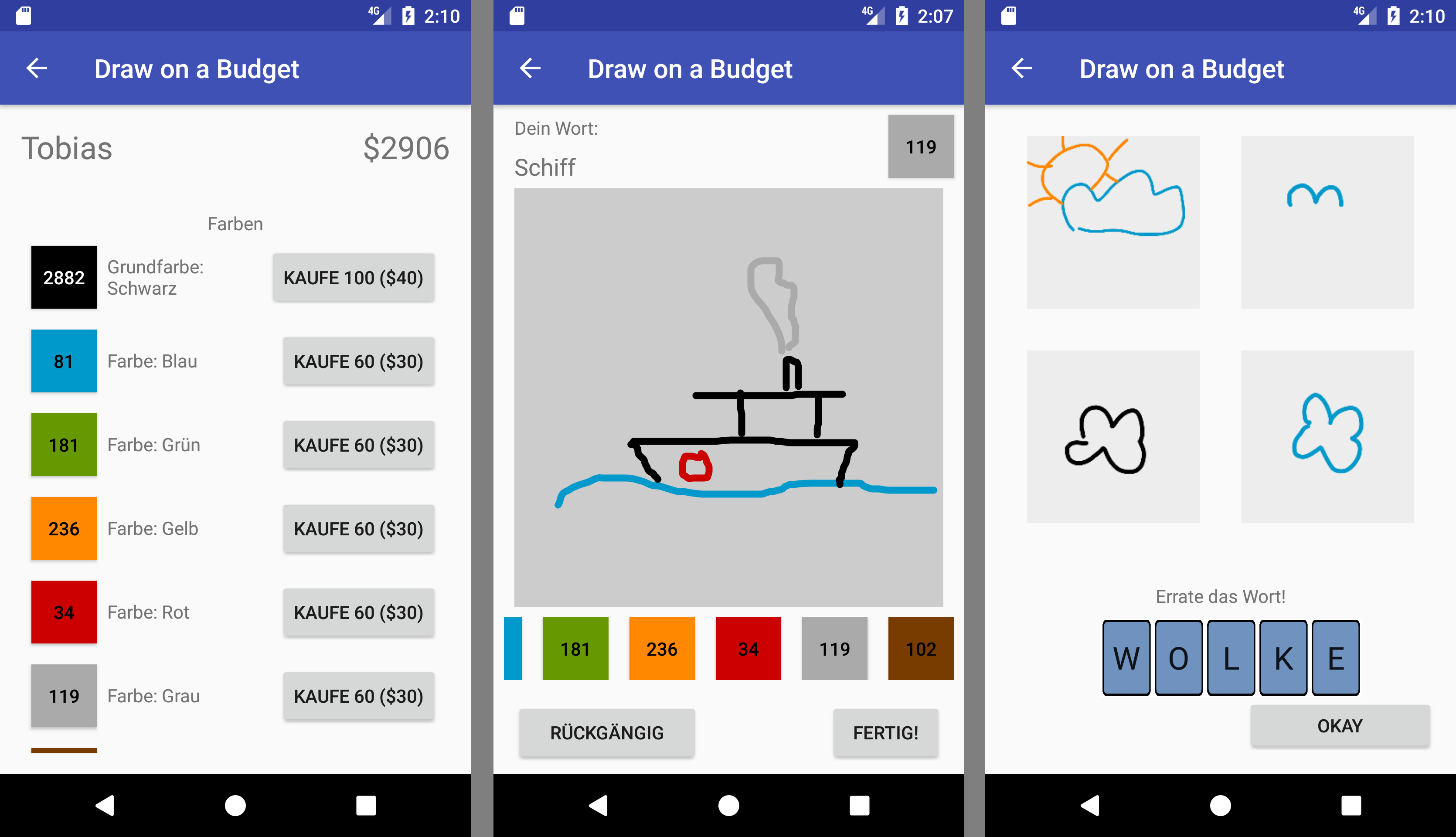 Drawing on a Bugdet is my first Android application. It's an app, where users get a word and draw it on their screen. Once they are finished, other players see their drawing side by side with other ones and guess what word was given. When they have it right, they can rate how much help each of the images provided. In contrast to other apps, in this variant the amount of color spent also matters. Drawing simple but distinctive is what earns the most points in the game.